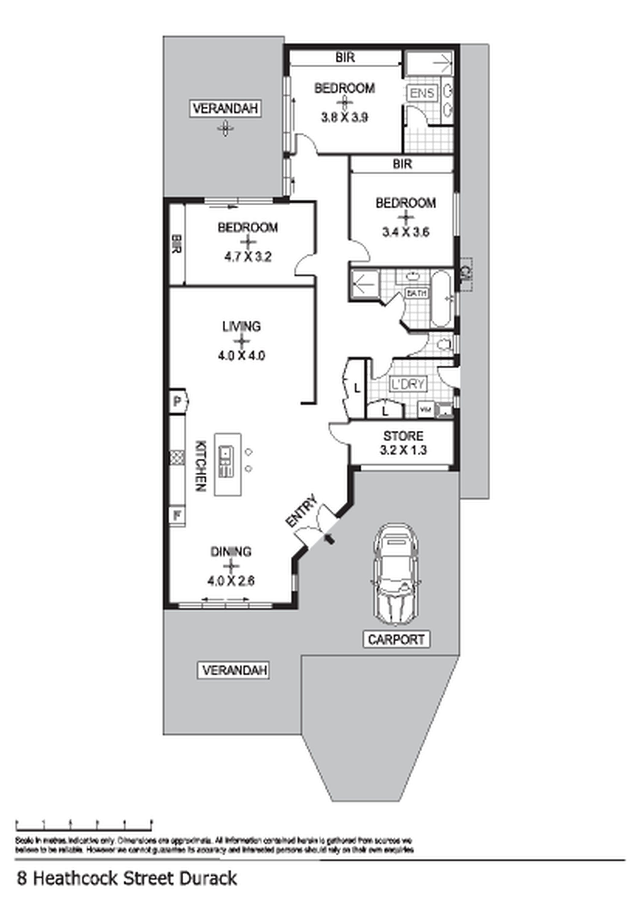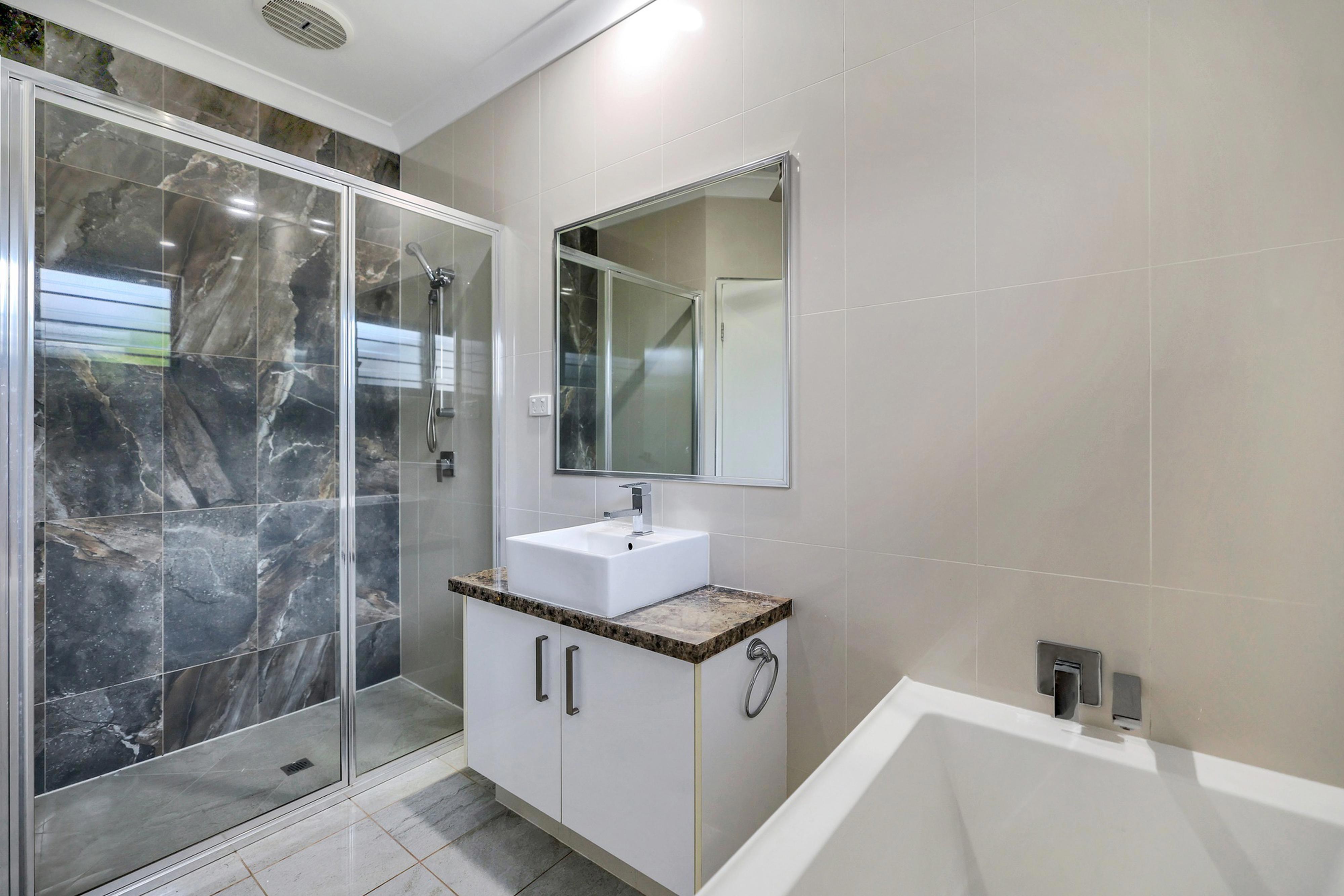 All of the bedrooms are generously sized and include tiled flooring along with a generous amounts of built in robe that boasts ample storage for each room. The master bedroom is further equipped with a private ensuite bathroom with twin vanity and a privacy glass door over the WC and a walk in shower. Bedrooms 1 and 2 both have a sliding door through to a private rear verandah that is shaded and cool. The main bathroom includes a relaxing bath tub and shower and sep toilet and the laundry room adjacent with storage in the hallway.